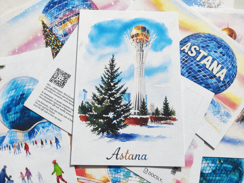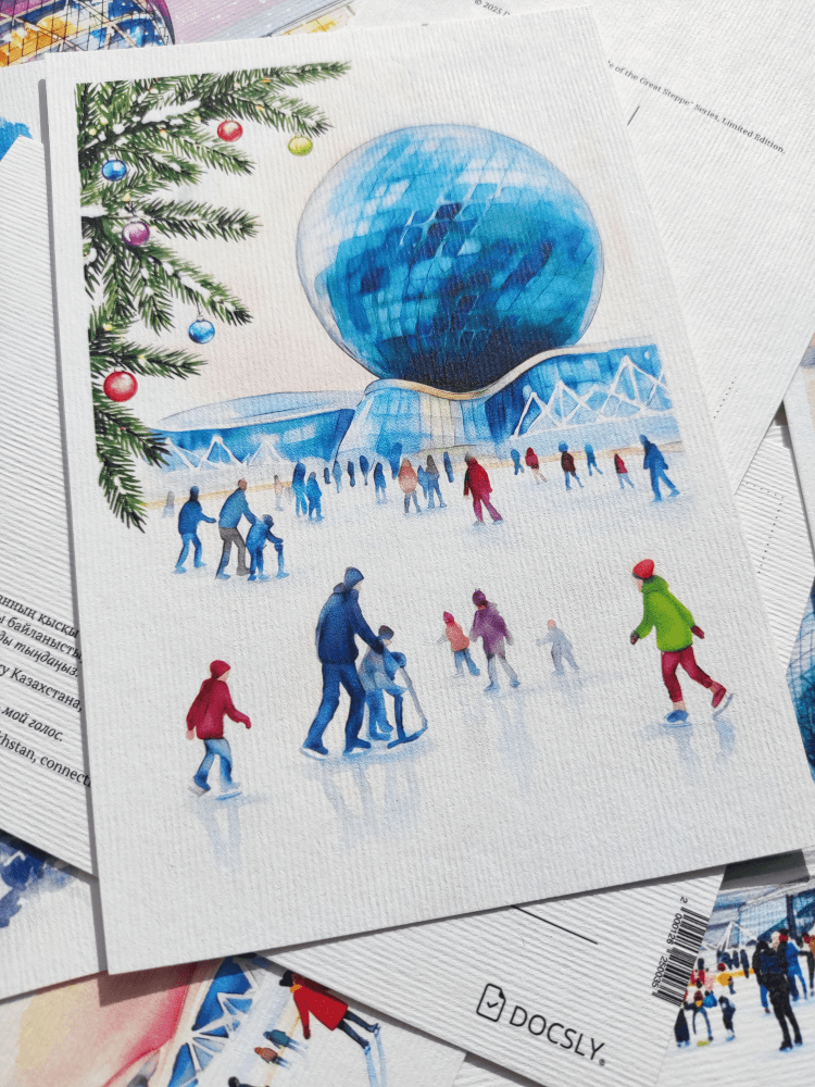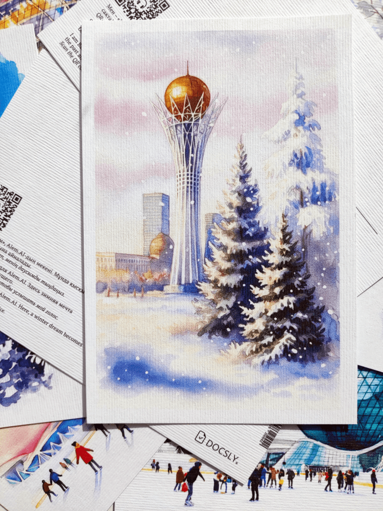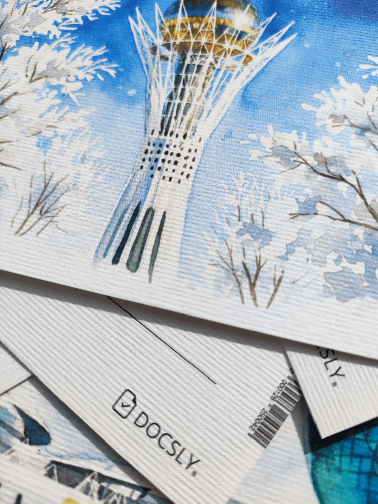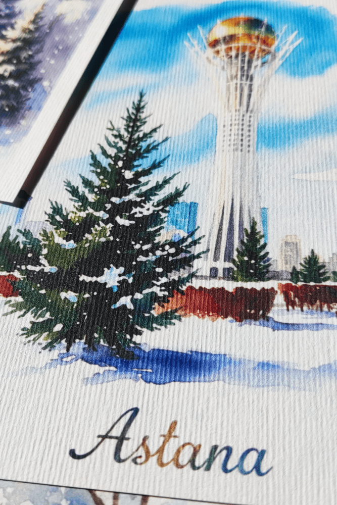 Акварельная серия открыток, запечатлевшая символы Астаны в теплых красках закатного солнца. Идеально для ценителей искусства.